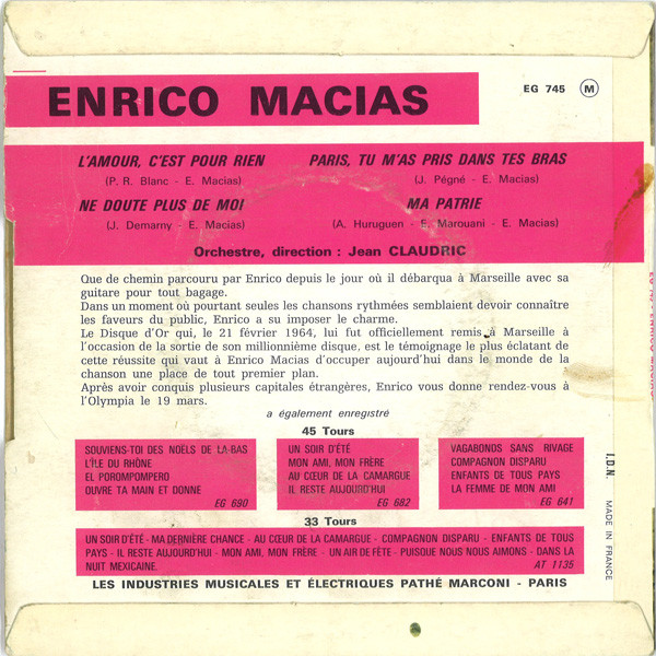 Ainsi, au tout début de l’année 1964 Enrico Macias contacte Jean Peigné, chef d’antenne à Europe 1 et occasionnellement parolier. Il a écrit pour Jean-Claude Pascal, Charles Aznavour, Les Djins Sisters, Pascal Danel ou encore Mireille Mathieu.